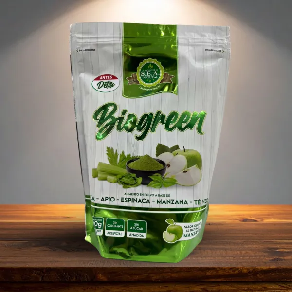 Contiene linaza, apio, espinaca, manzana y té verde.